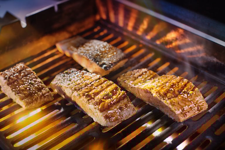 Un plato exquisito que combina la jugosidad del salmón con el sabor ahumado de las verduras a la parrilla.