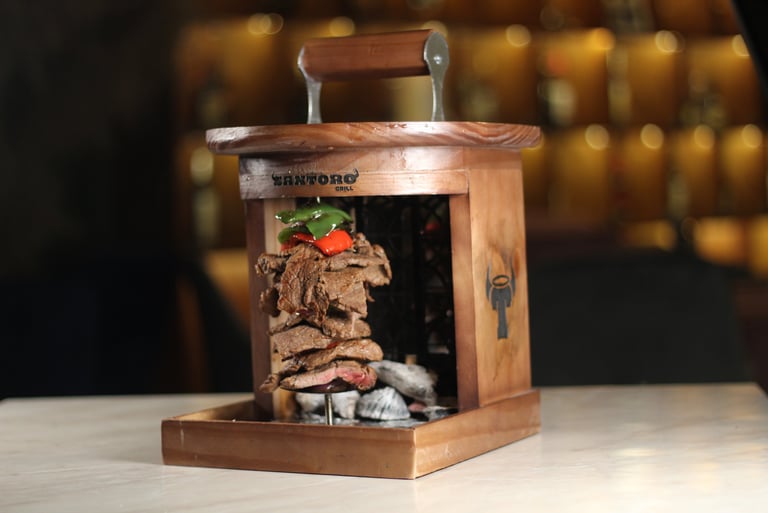 Jugoso sirloin marinado por horas en cerveza oscura con pimientos y cebolla morada presentados en estilo de trompo servido a su mesa, acompañados con tortillas de maíz y tortilla taquera.