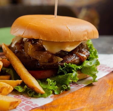 Jugosa Carne 100% Black Angus, pan brioche, lechuga y jitomate fresco. Todo esto coronado con queso brie derretido y una irresistible mermelada de cebolla. Acompañada de papas a la francesa.
