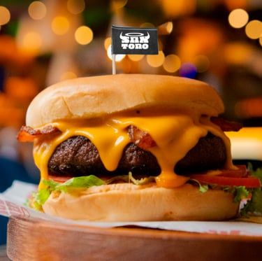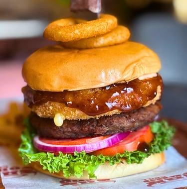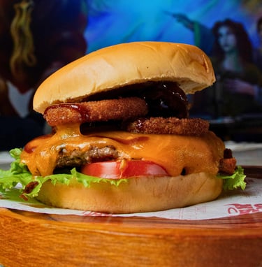 Carne 100% Black Angus a la parrilla, pan brioche, jitomate, queso cheddar, lechuga, aros de cebolla empanizados, bañados en salsa BBQ de la casa. Acompañada de papas a la francesa.
