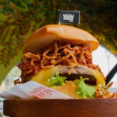 Jugosa carne 100% Black Angus a la parrilla con disco crujiente de queso gouda empanizado, pan brioche, lechuga, jitomate, aderezo de la casa y coronada con aros de cebolla.