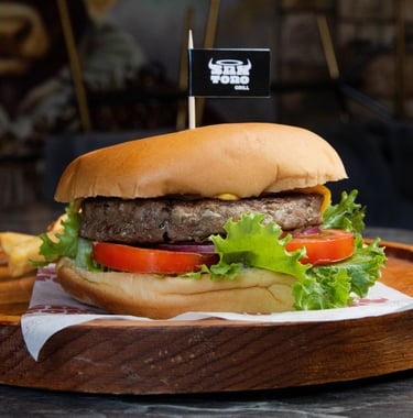 Jugosa y deliciosa carne molida 100% angus. Montada sobre pan brioche, lechuga, jitomate, cebolla morada, queso americano y aderezo especial. Acompañada de papas a la francesa.